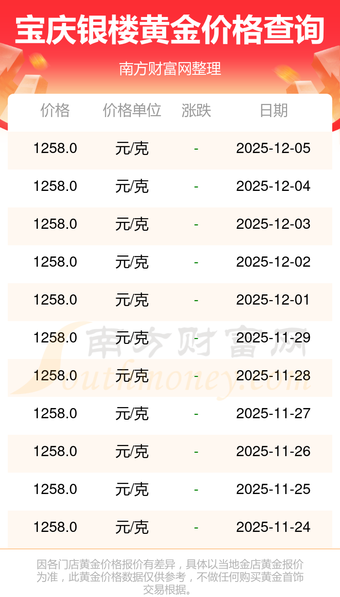 今日宝庆银楼所公布的 黄金价格最新价格为1258.0元/克。