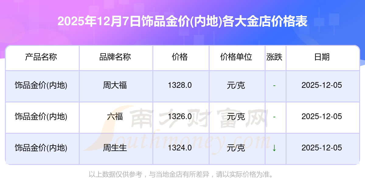 2025年12月7日,周大福、周大福、周大福、周大福、周大福、周大福、周大福、老凤祥、老凤祥、老凤祥、周六福等各大金店品牌饰品金价(内地)今日价格如下:周大福1328.0元/克、周大福662.0元/克、周大福1328.0元/克、周大福46550.0、周大福18970.0、周大福41990.0、周大福1165.0元/克、老凤祥1325.0元/克、老凤祥600.0元/克、老凤祥1325.0元/克、周六福1289.0元/克。