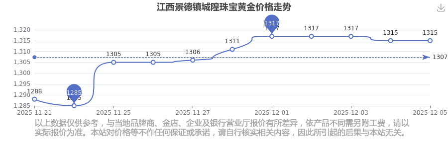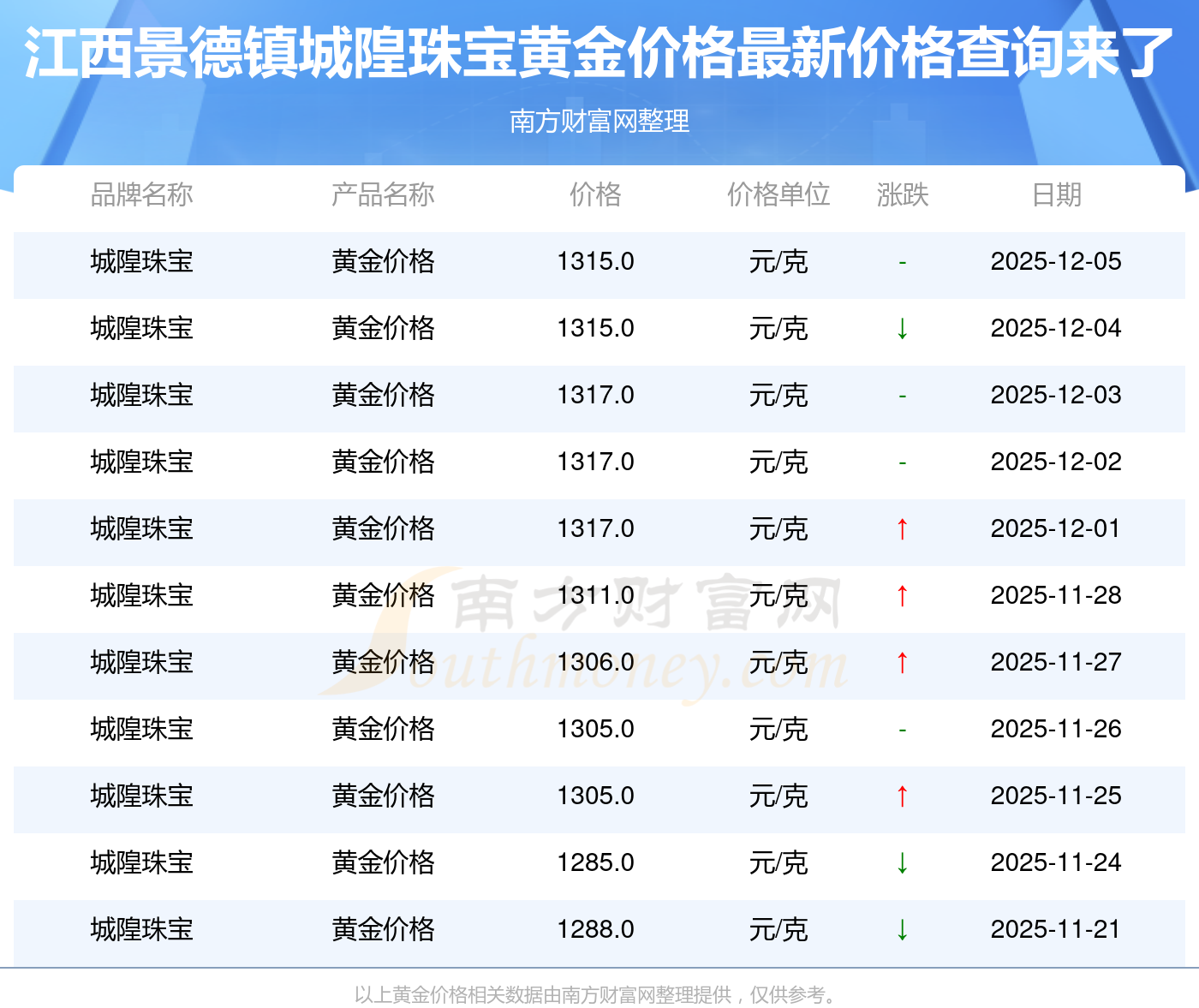 今日(2025年12月7日),1315.0元/克是江西景德镇城隍珠宝黄金价格的价格标准。