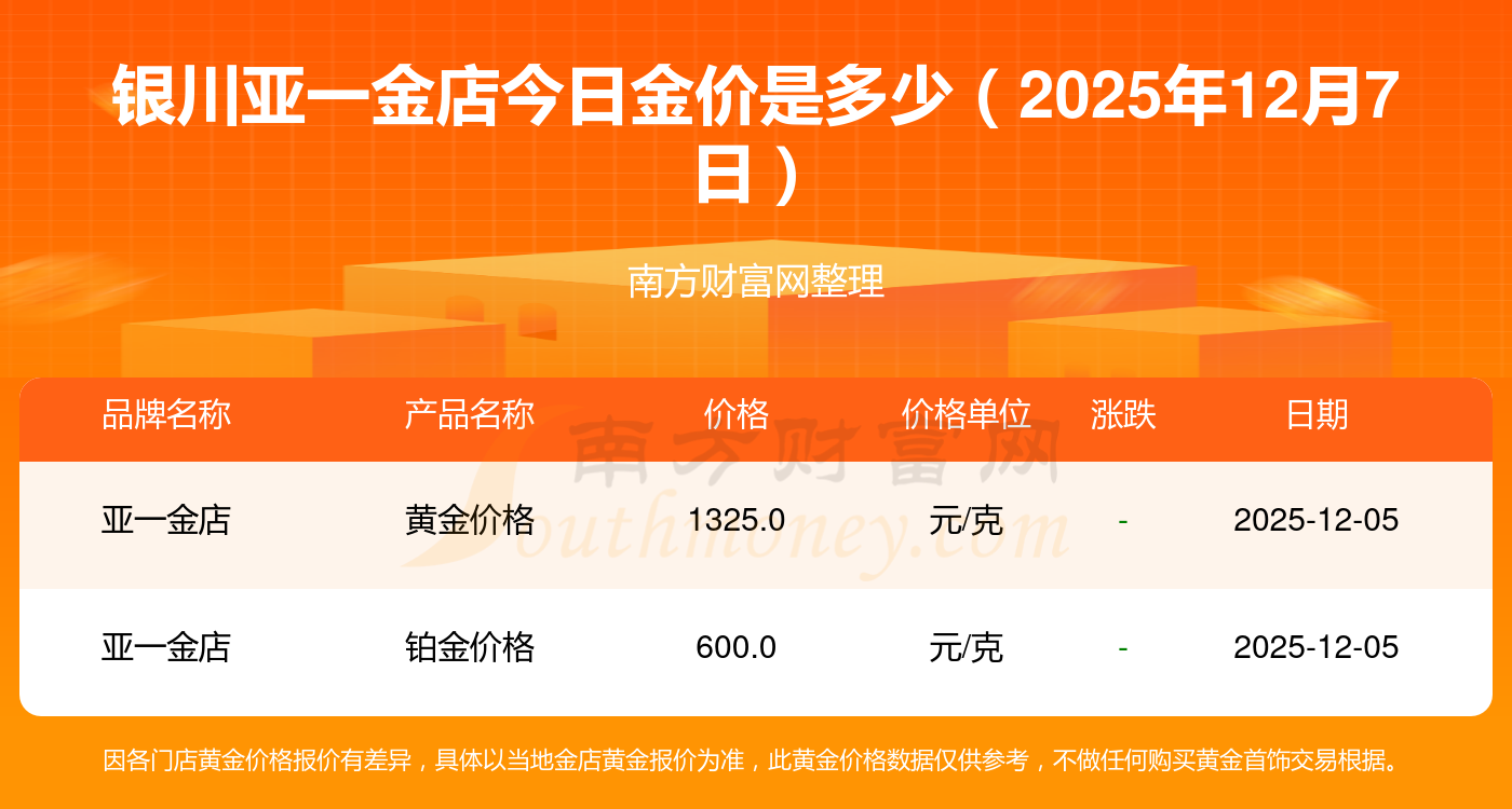 2025年12月7日银川亚一金店现在黄金一克要多少钱:黄金价格1328.0元/克,铂金价格662.0元/克,饰品金价(内地)1328.0元/克,黄金饰品(香港)46550.0,铂金价格(香港)18970.0,金条价格(香港)41990.0,金条金价(内地)1165.0元/克,黄金价格1325.0元/克,铂金价格600.0元/克,足金价格1325.0元/克,黄金价格1289.0元/克。