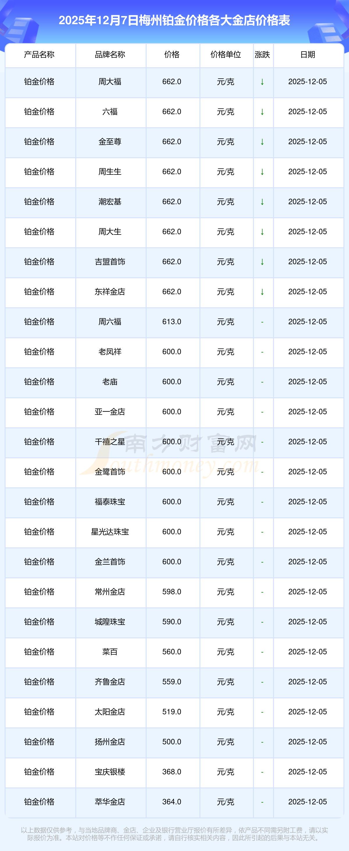 以上数据仅供参考,与当地品牌商、金店、企业及银行营业厅报价有所差异,依产品不同需另附工费,请以实际报价为准。本站对价格等不作任何保证或承诺,请自行核实相关内容,因此所引起的后果与本站无关。