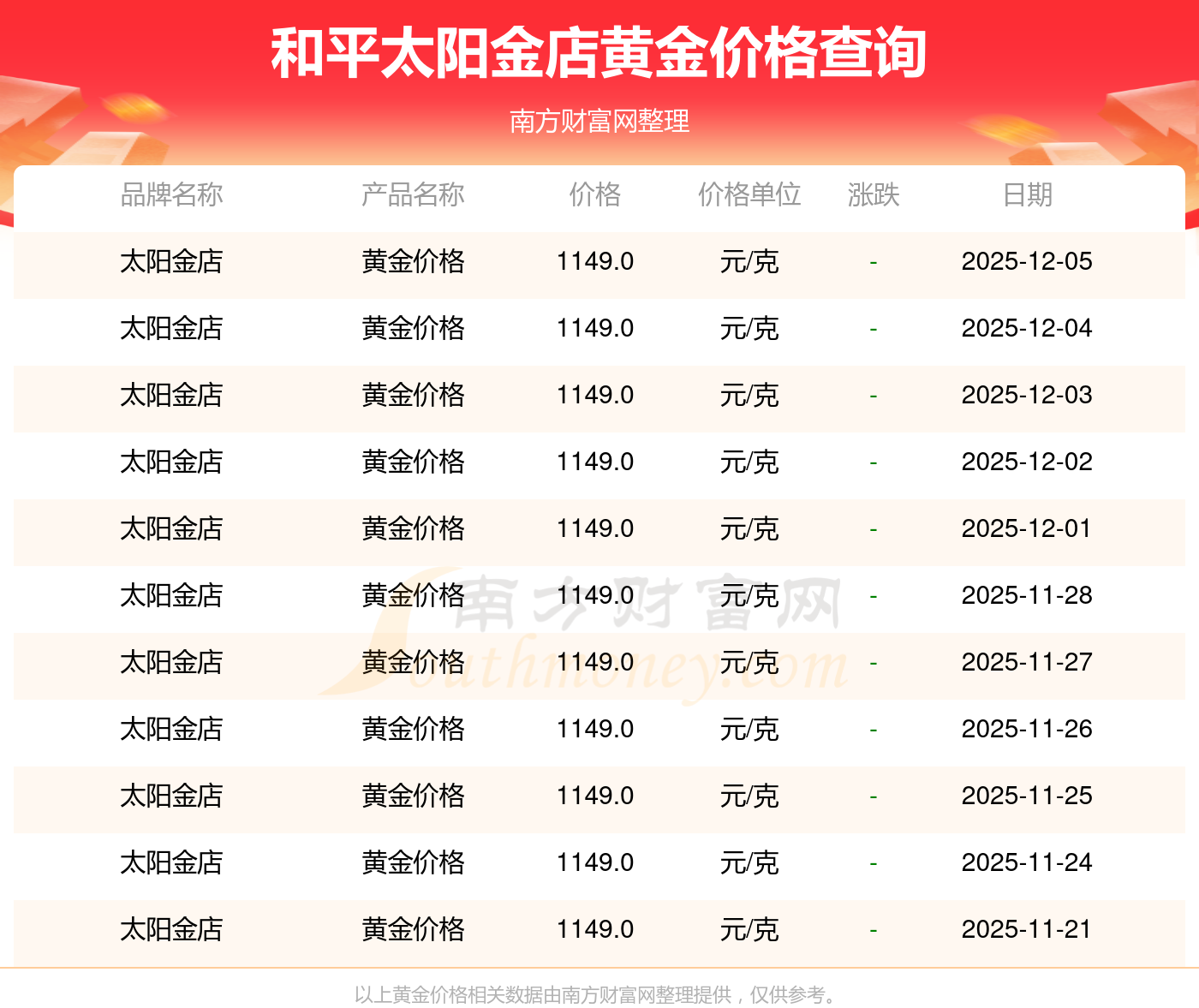 目前,黄金价格报价区间在1328.0元/克和1146.0元/克之间。最高的为周大福,报价1328.0元/克,最低的为齐鲁金店,报价1146.0元/克。今日黄金价格高低差为182元/克。