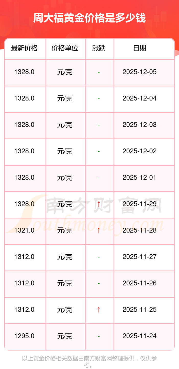 2025年12月7日周大福黄金价格为1328.0元/克。