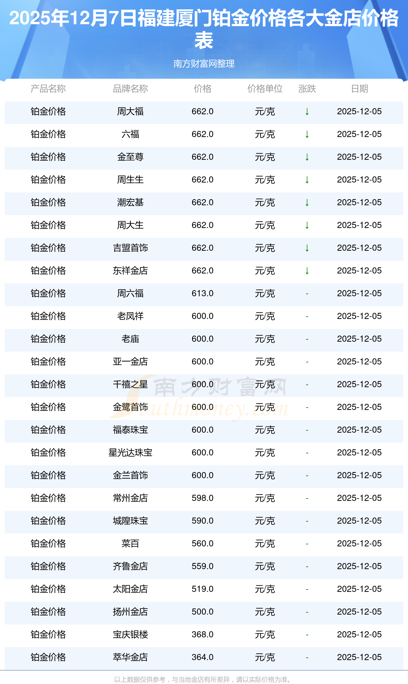 今天是2025年12月7日,福建厦门周大福、周大福、周大福、周大福、周大福、周大福、周大福、老凤祥、老凤祥、老凤祥、周六福等各大金店品牌铂金价格最新价格行情是这样的:周大福1328.0元/克、周大福662.0元/克、周大福1328.0元/克、周大福46550.0、周大福18970.0、周大福41990.0、周大福1165.0元/克、老凤祥1325.0元/克、老凤祥600.0元/克、老凤祥1325.0元/克、周六福1289.0元/克。