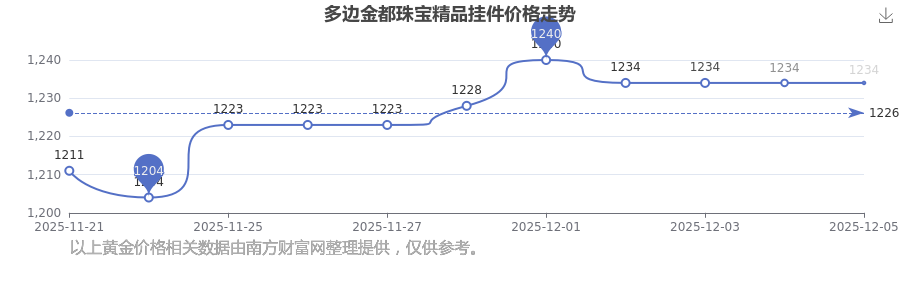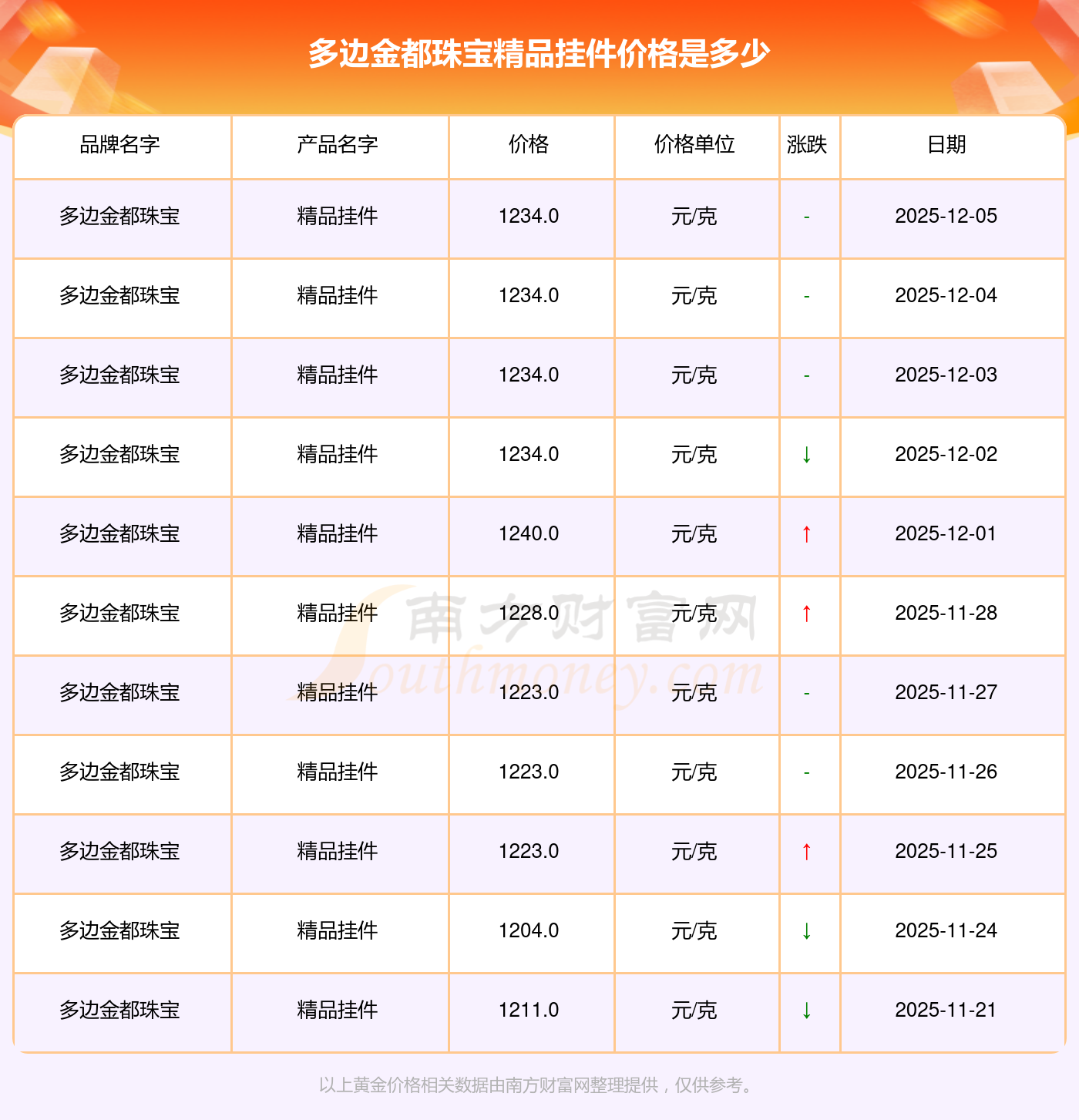 2025年12月7日多边金都珠宝精品挂件价格为1234.0元/克。