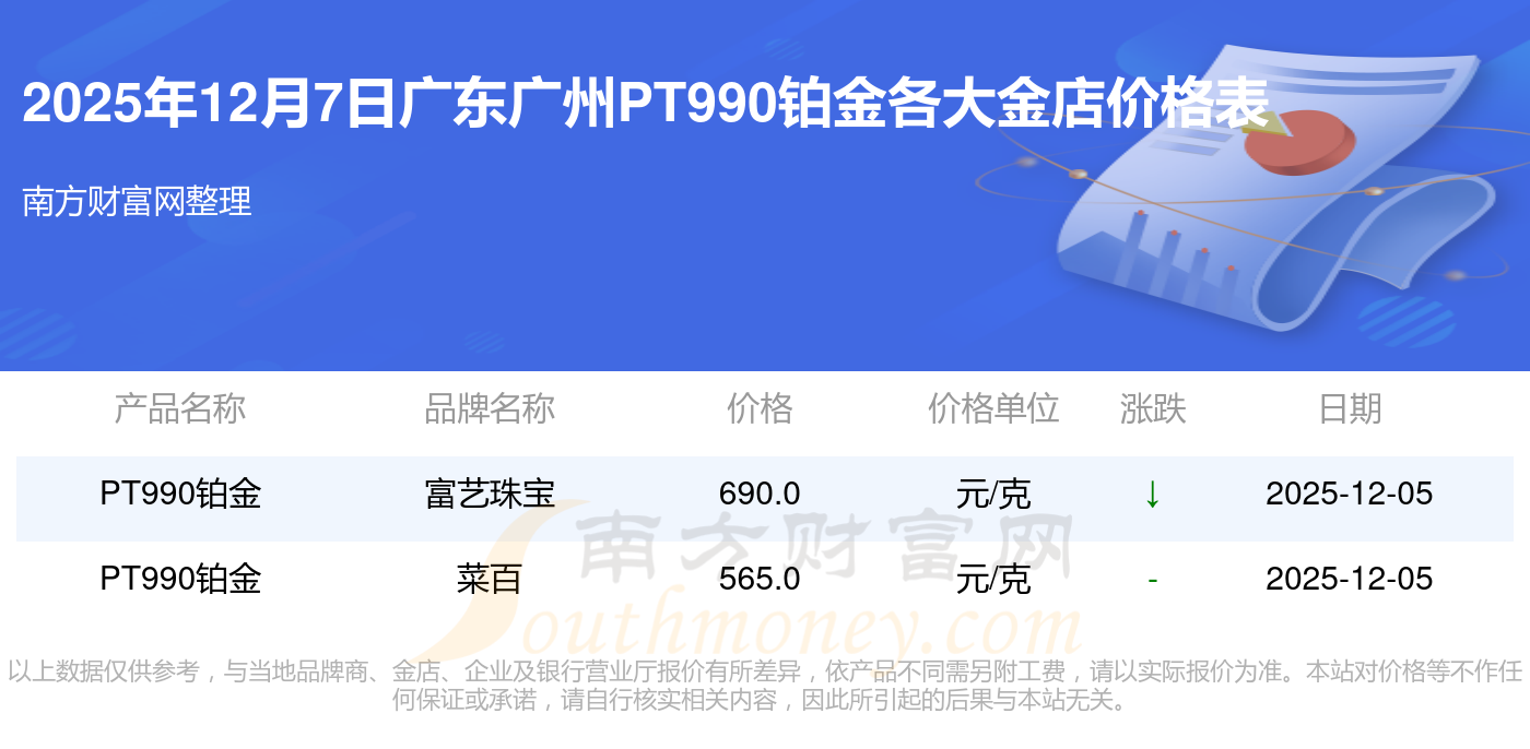 2025年12月7日,广东广州周大福、周大福、周大福、周大福、周大福、周大福、周大福、老凤祥、老凤祥、老凤祥、周六福等各大金店品牌PT990铂金今日价格如下:周大福1328.0元/克、周大福662.0元/克、周大福1328.0元/克、周大福46550.0、周大福18970.0、周大福41990.0、周大福1165.0元/克、老凤祥1325.0元/克、老凤祥600.0元/克、老凤祥1325.0元/克、周六福1289.0元/克。