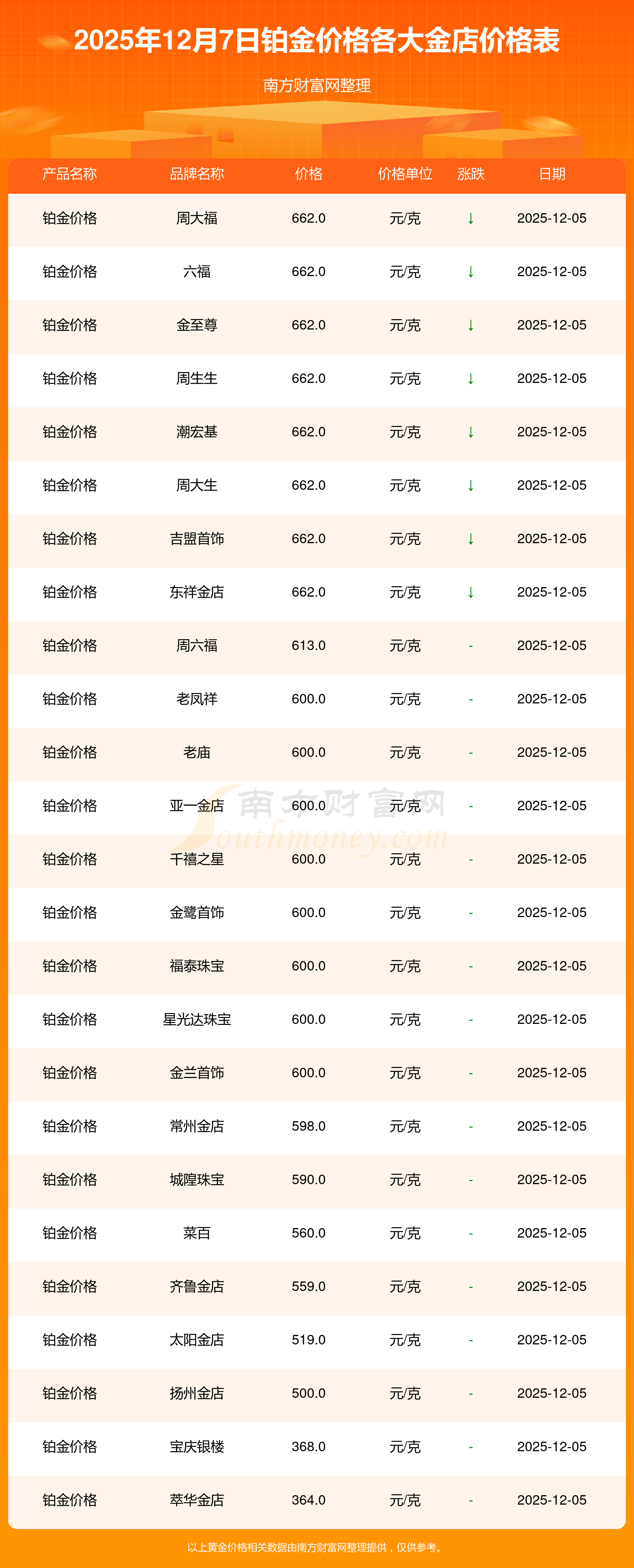 2025年12月7日,周大福、周大福、周大福、周大福、周大福、周大福、周大福、老凤祥、老凤祥、老凤祥、周六福等各大金店品牌铂金价格今日价格如下:周大福1328.0元/克、周大福662.0元/克、周大福1328.0元/克、周大福46550.0、周大福18970.0、周大福41990.0、周大福1165.0元/克、老凤祥1325.0元/克、老凤祥600.0元/克、老凤祥1325.0元/克、周六福1289.0元/克。