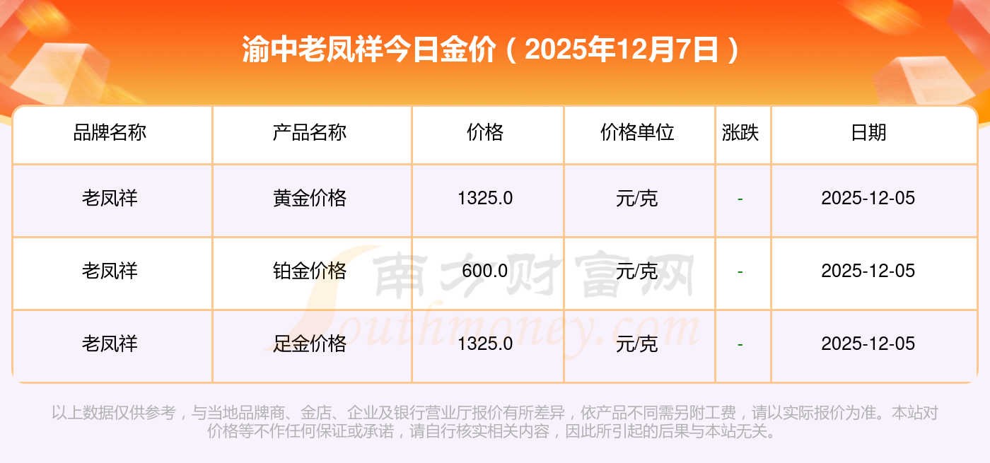 2025年12月7日渝中老凤祥今日价格:黄金价格1328.0元/克,铂金价格662.0元/克,饰品金价(内地)1328.0元/克,黄金饰品(香港)46550.0,铂金价格(香港)18970.0,金条价格(香港)41990.0,金条金价(内地)1165.0元/克,黄金价格1325.0元/克,铂金价格600.0元/克,足金价格1325.0元/克,黄金价格1289.0元/克。