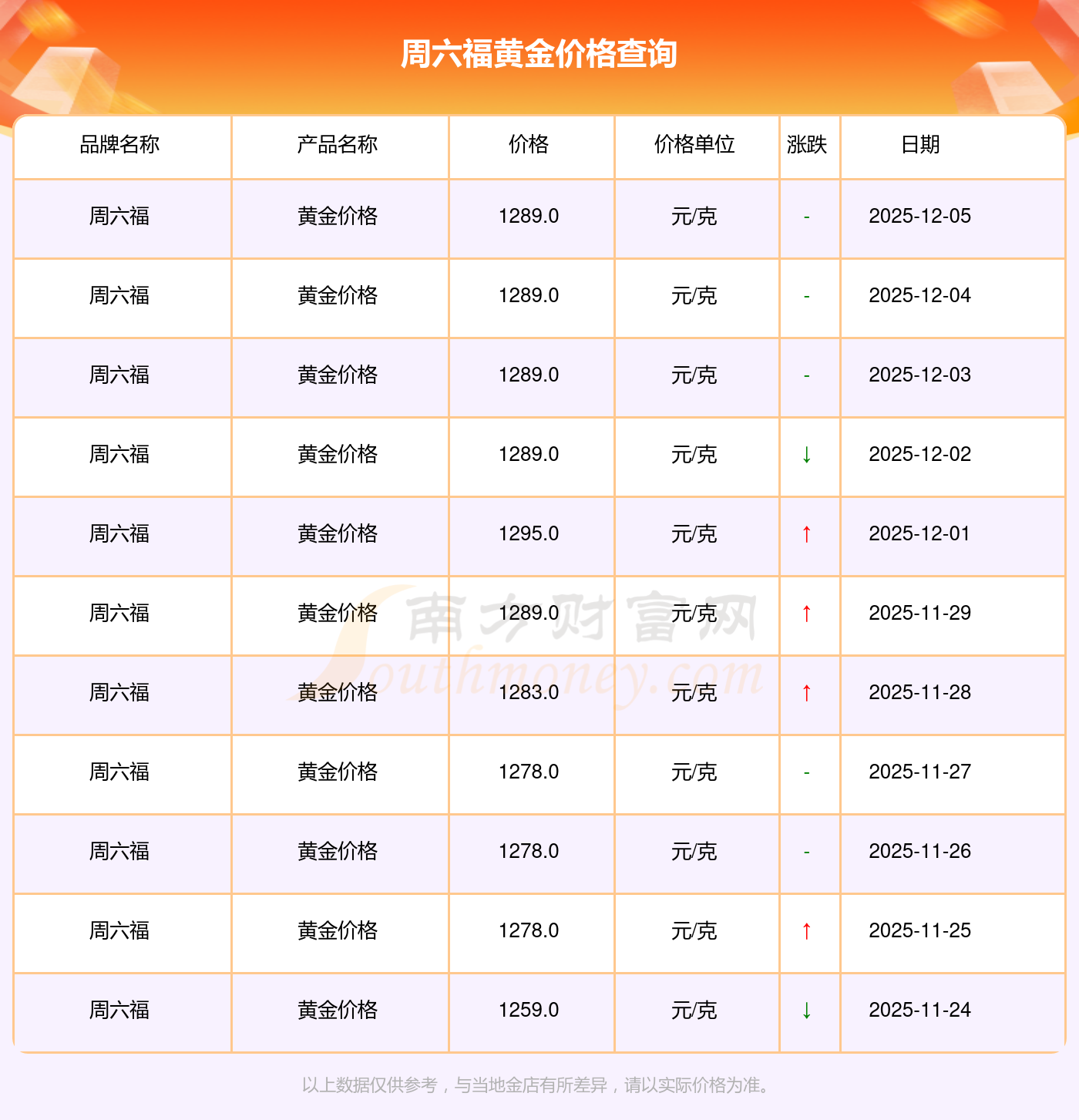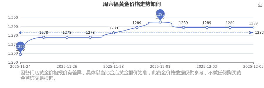 今天黄金价格行情如何?现在一克黄金的售价是多少?黄金每克的价位一般在什么水平呢?2025年12月7日周六福黄金价格最新是1289.0元/克。