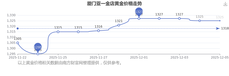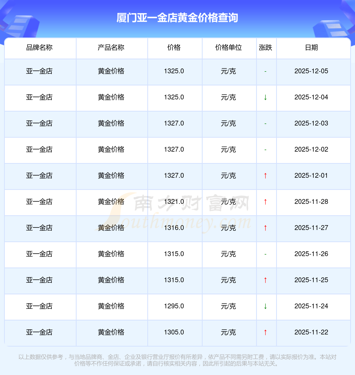今日(2025年12月7日)厦门亚一金店黄金价格为1325.0元/克。