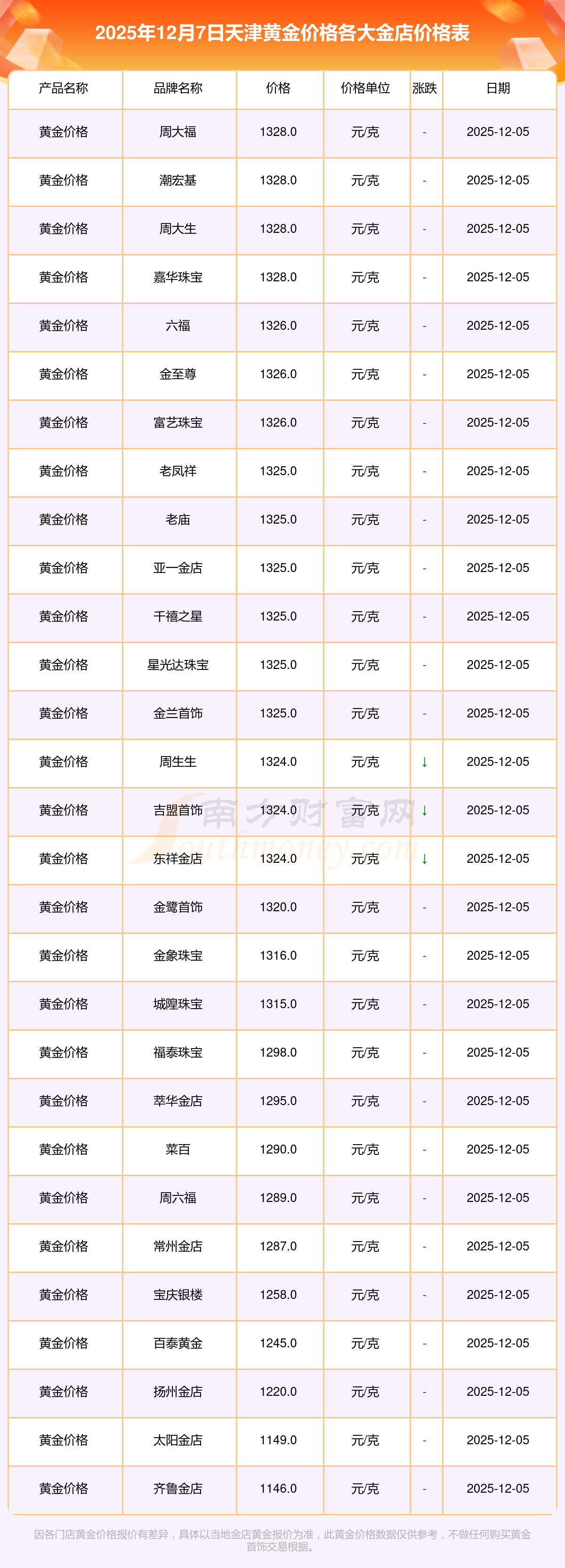 2025年12月7日天津各大金店黄金价格最新价格查询来了:周大福1328.0元/克,周大福662.0元/克,周大福1328.0元/克,周大福46550.0,周大福18970.0,周大福41990.0,周大福1165.0元/克,老凤祥1325.0元/克,老凤祥600.0元/克,老凤祥1325.0元/克,周六福1289.0元/克。
