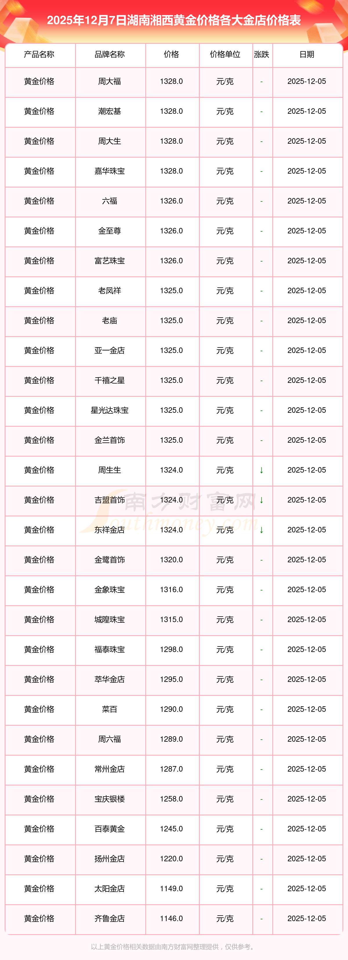 2025年12月7日湖南湘西各金店黄金价格是怎么样的?湖南湘西各金店黄金价格查询