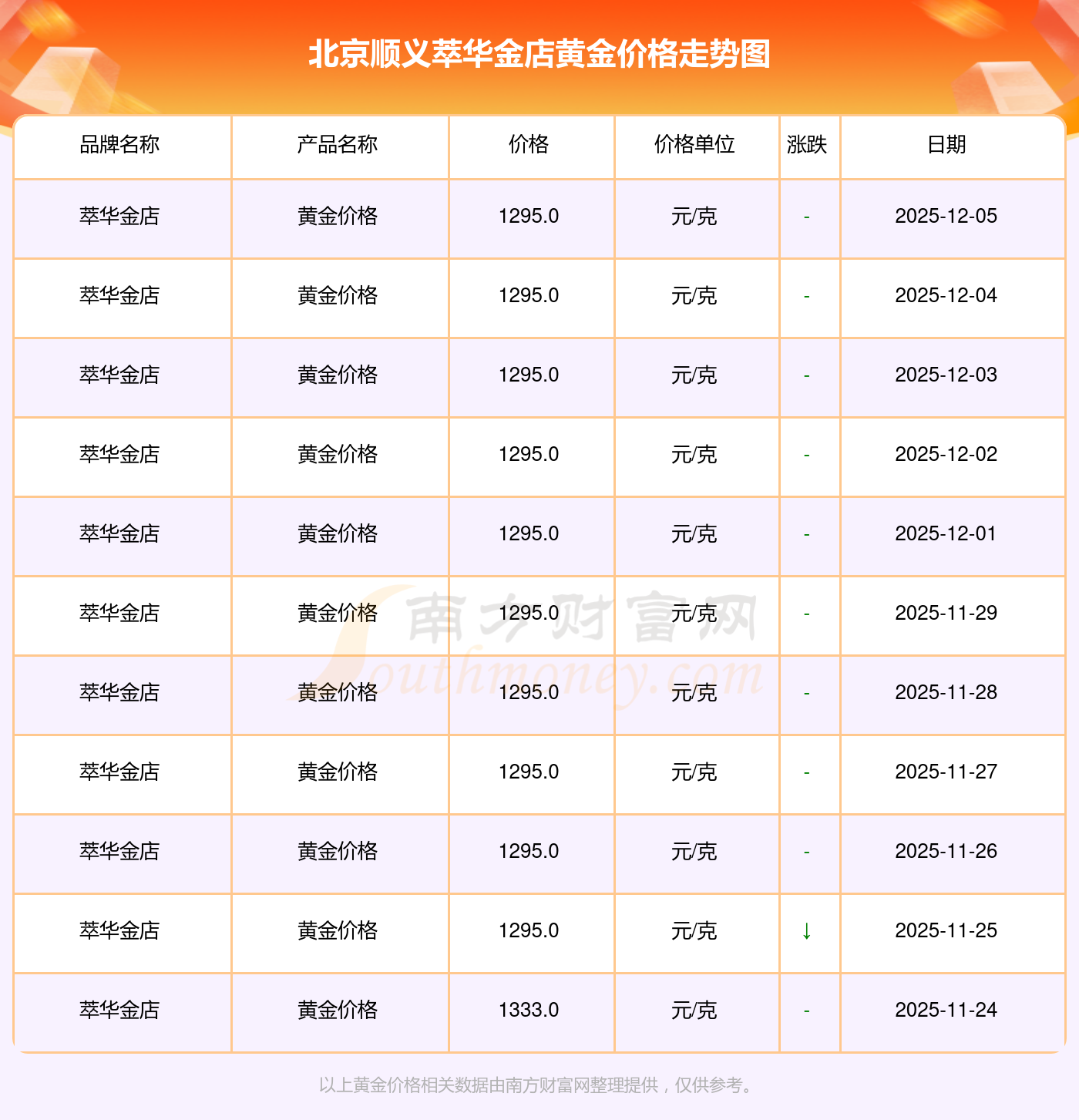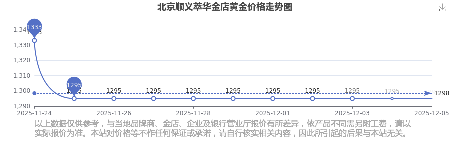 2025年12月7日北京顺义萃华金店黄金价格:1295.0元/克。