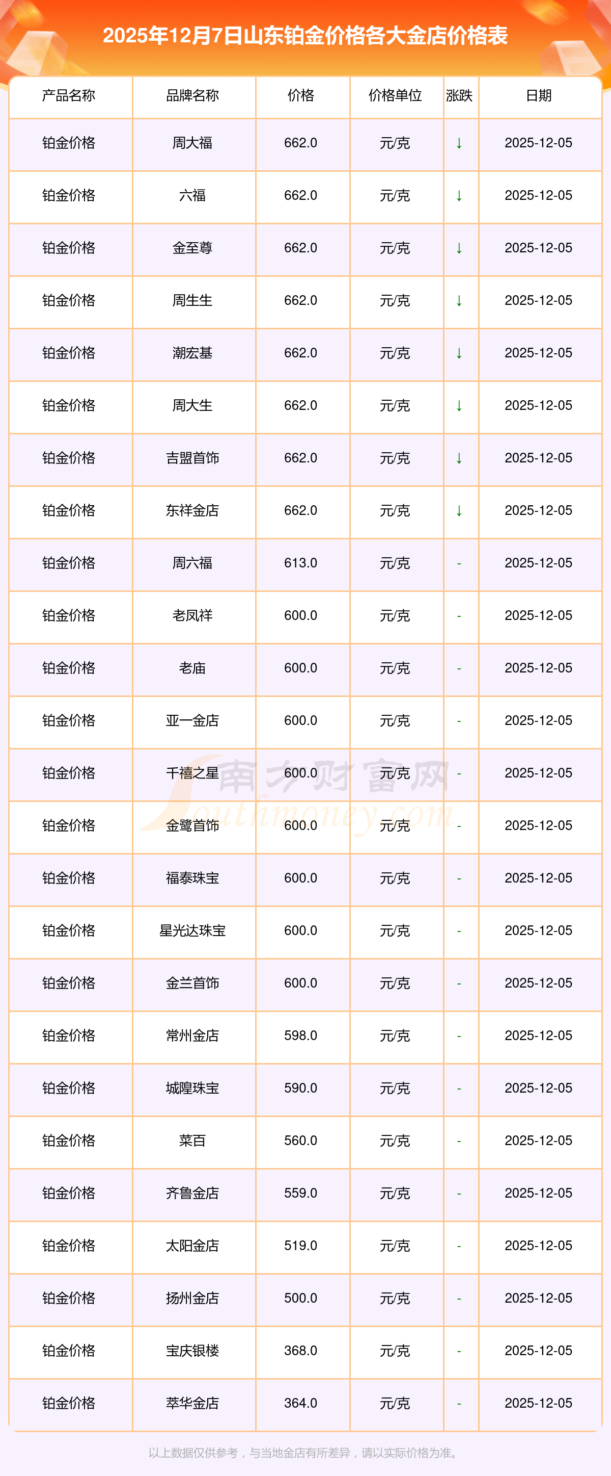 今天是2025年12月7日,山东周大福、周大福、周大福、周大福、周大福、周大福、周大福、老凤祥、老凤祥、老凤祥、周六福等各大金店品牌铂金价格最新价格行情是这样的:周大福1328.0元/克、周大福662.0元/克、周大福1328.0元/克、周大福46550.0、周大福18970.0、周大福41990.0、周大福1165.0元/克、老凤祥1325.0元/克、老凤祥600.0元/克、老凤祥1325.0元/克、周六福1289.0元/克。