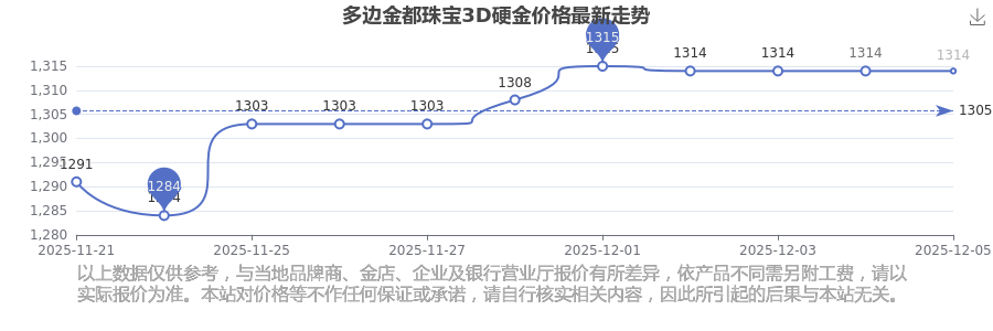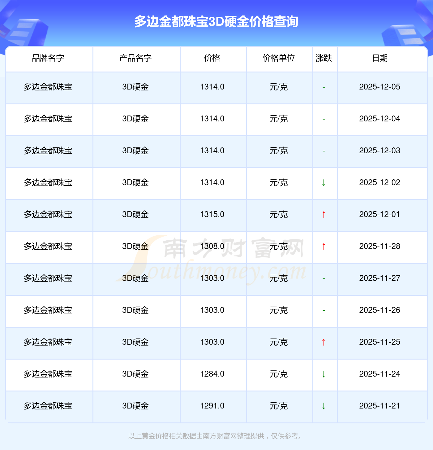 多边金都珠宝今日3D硬金的最新标价为1314.0元/克。
