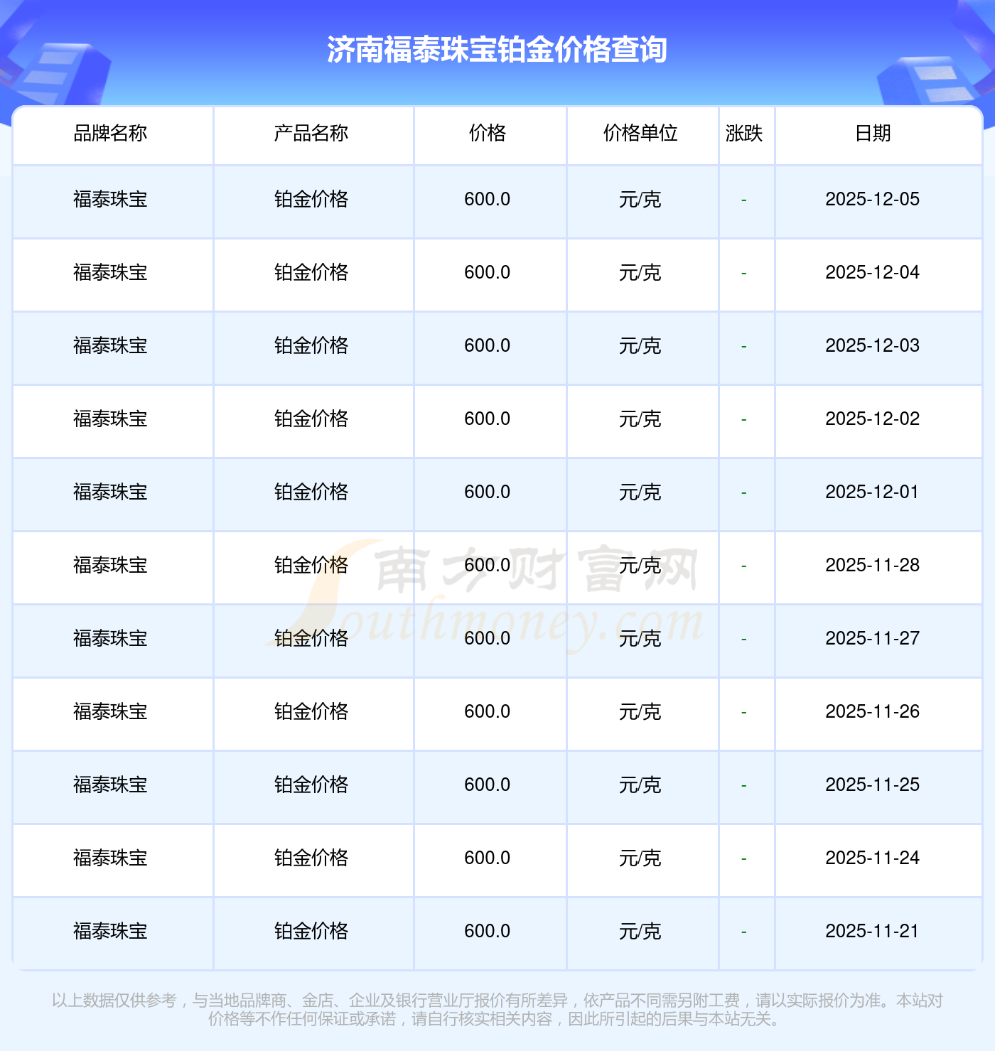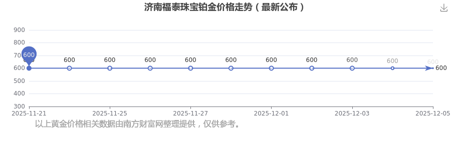 今日(2025年12月7日)济南福泰珠宝铂金价格是600.0元/克。