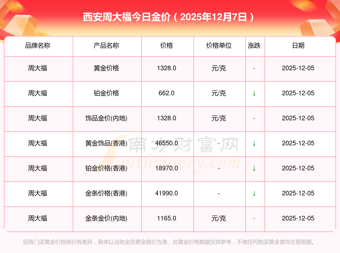 2025年12月7日西安周大福最新价格:黄金价格1328.0元/克,铂金价格662.0元/克,饰品金价(内地)1328.0元/克,黄金饰品(香港)46550.0,铂金价格(香港)18970.0,金条价格(香港)41990.0,金条金价(内地)1165.0元/克,黄金价格1325.0元/克,铂金价格600.0元/克,足金价格1325.0元/克,黄金价格1289.0元/克。