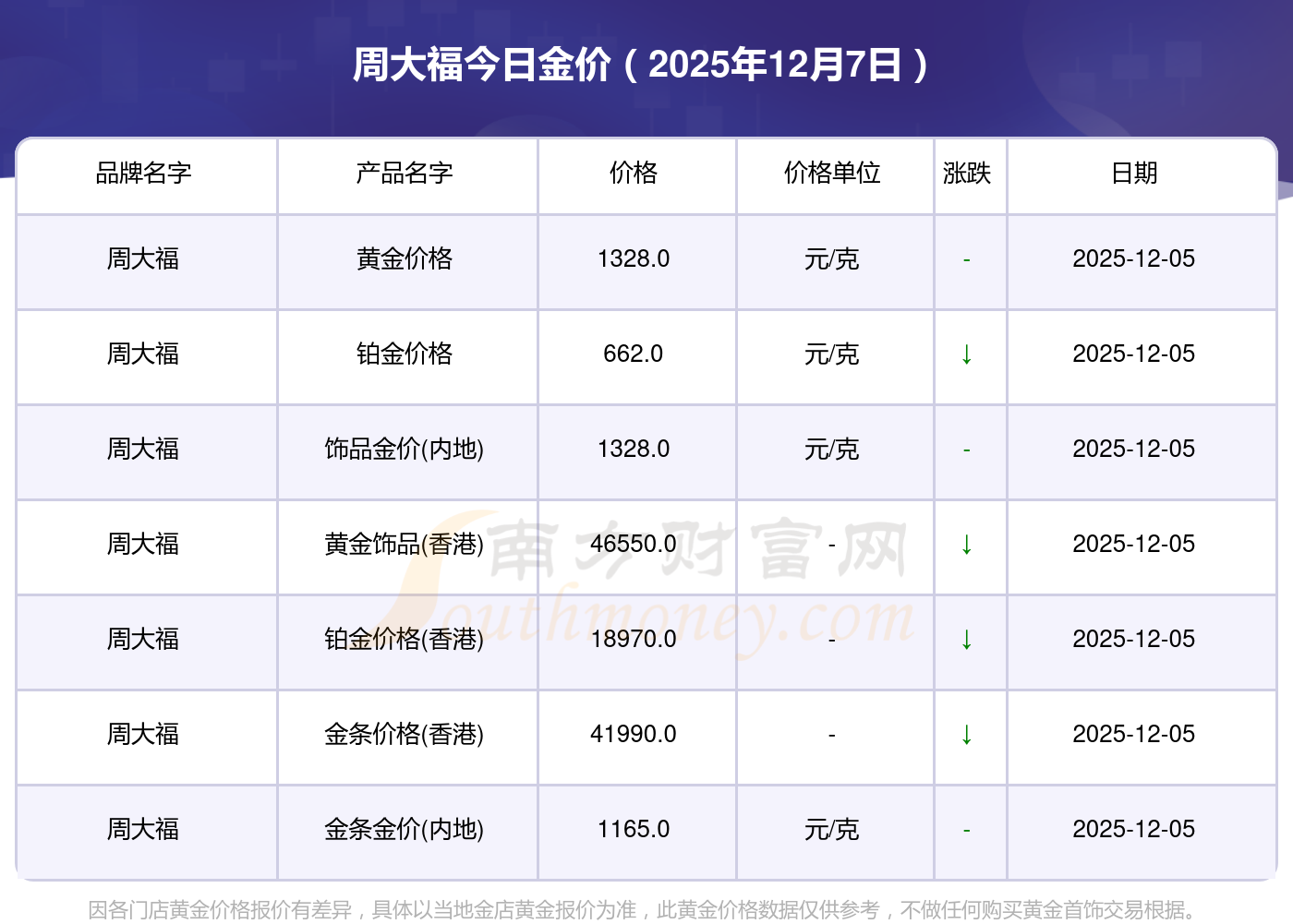 2025年12月7日周大福最新价格:黄金价格1328.0元/克,铂金价格662.0元/克,饰品金价(内地)1328.0元/克,黄金饰品(香港)46550.0,铂金价格(香港)18970.0,金条价格(香港)41990.0,金条金价(内地)1165.0元/克,黄金价格1325.0元/克,铂金价格600.0元/克,足金价格1325.0元/克,黄金价格1289.0元/克。