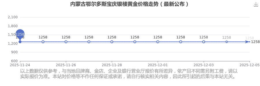 内蒙古鄂尔多斯宝庆银楼的黄金价格在今日(2025年12月7日),每克售价为1258.0元/克。