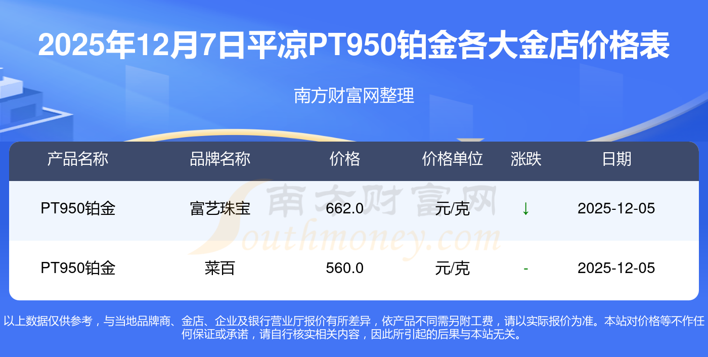 今天PT950铂金价格查询最新,2025年12月7日平凉各大金店PT950铂金价格表来了