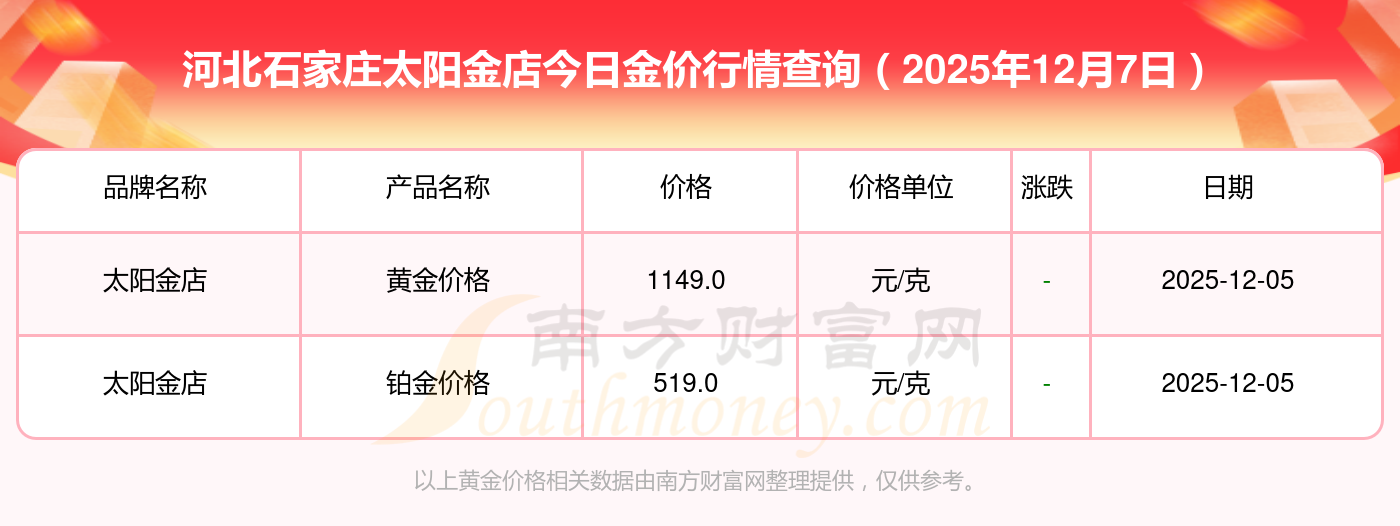 河北石家庄太阳金店金价今日价格:
