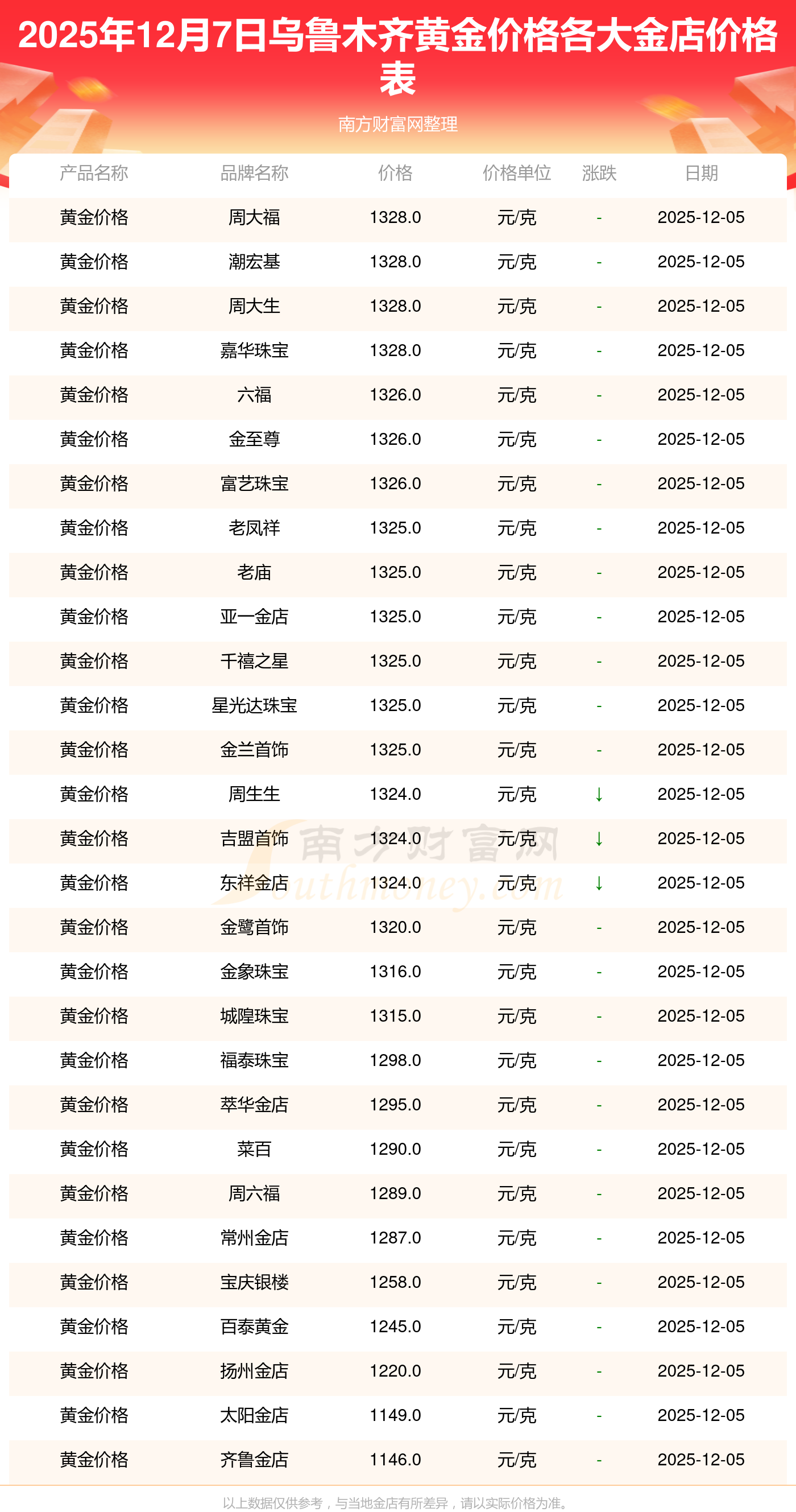 今天是2025年12月7日,乌鲁木齐周大福、周大福、周大福、周大福、周大福、周大福、周大福、老凤祥、老凤祥、老凤祥、周六福等各大金店品牌黄金价格最新价格如下:周大福1328.0元/克、周大福662.0元/克、周大福1328.0元/克、周大福46550.0、周大福18970.0、周大福41990.0、周大福1165.0元/克、老凤祥1325.0元/克、老凤祥600.0元/克、老凤祥1325.0元/克、周六福1289.0元/克。