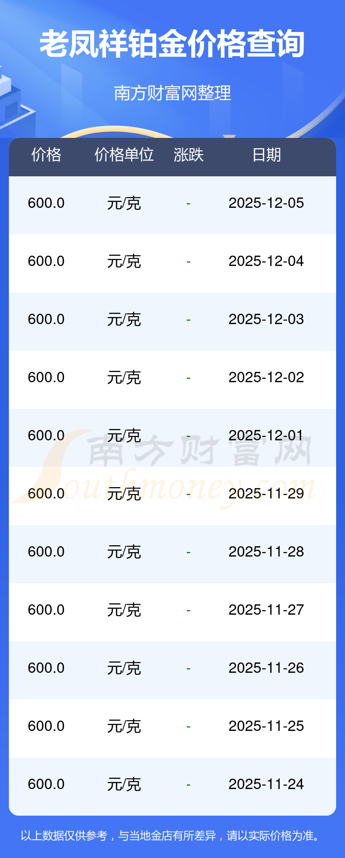 今日(2025年12月7日)老凤祥铂金价格为600.0元/克。