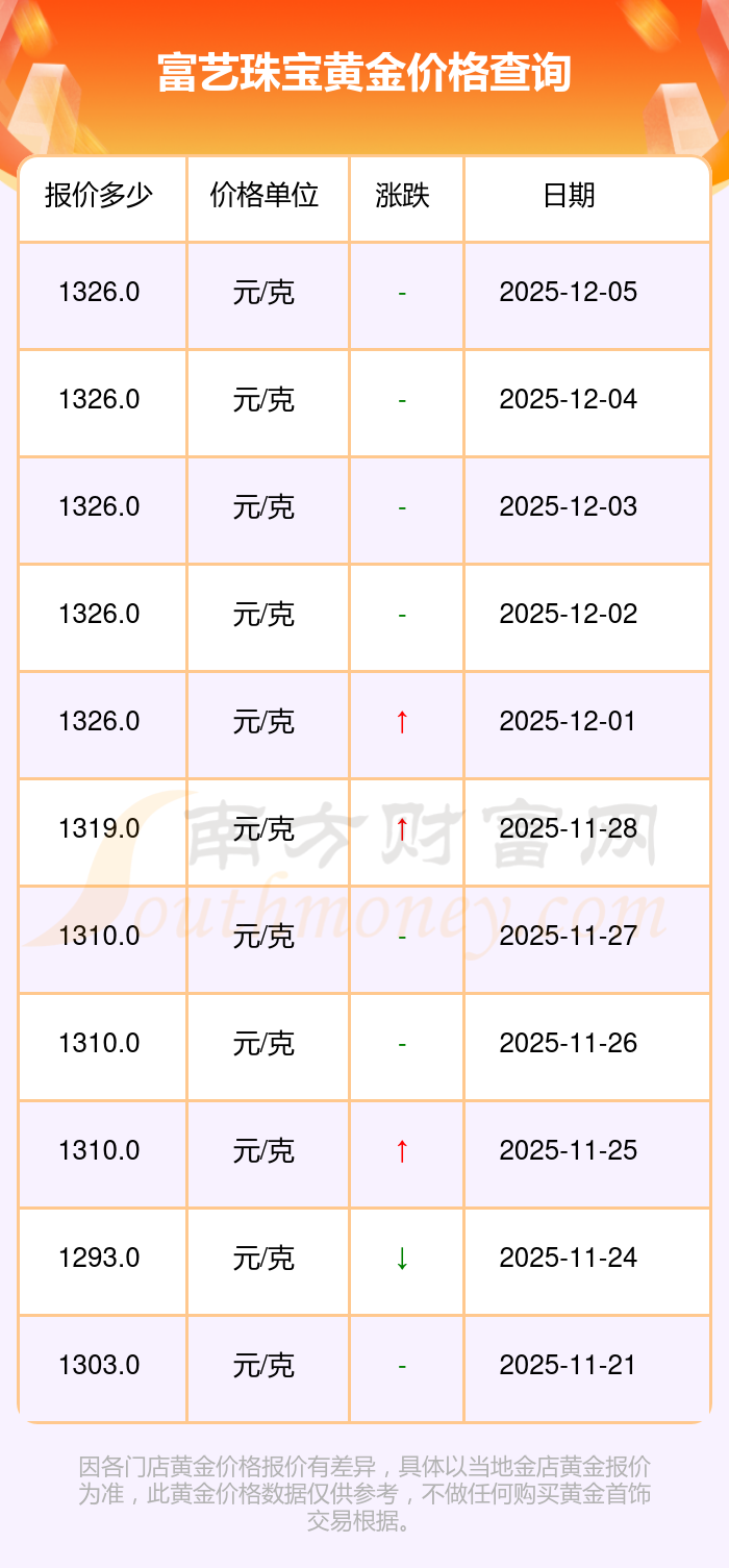 富艺珠宝 黄金价格在今日的最新价格显示为1326.0元/克。