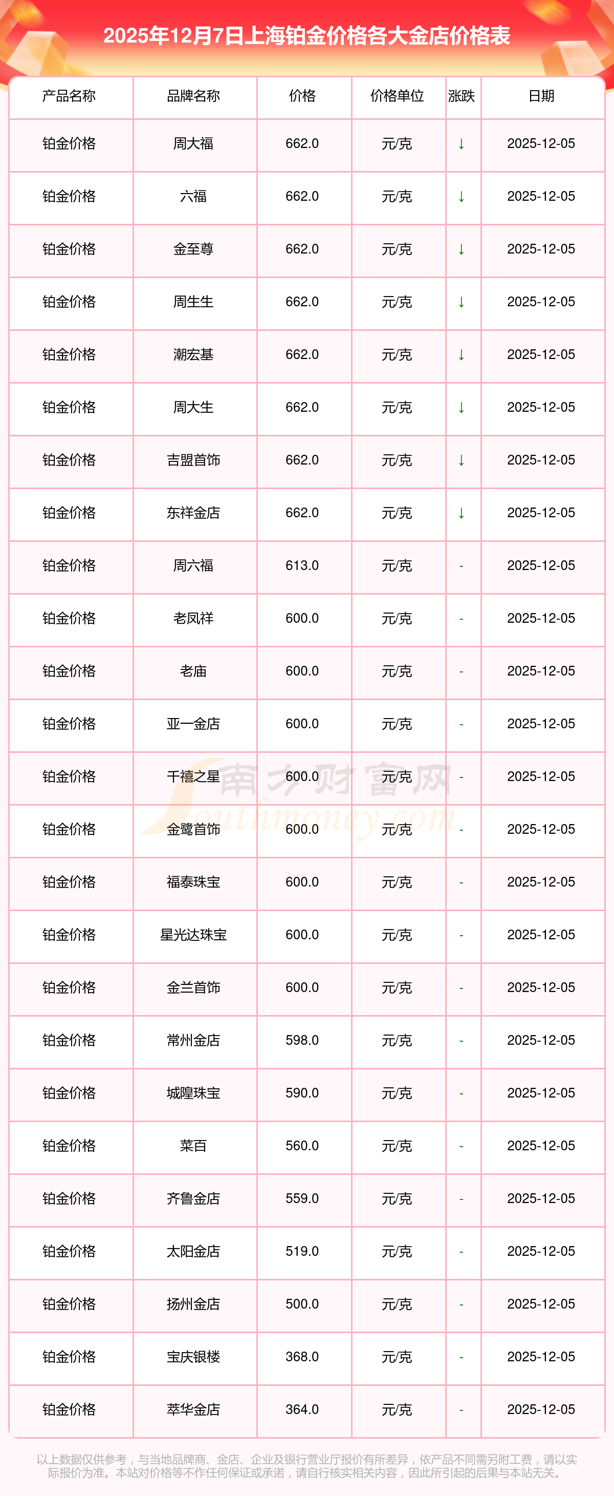 2025年12月7日上海周大福、周大福、周大福、周大福、周大福、周大福、周大福、老凤祥、老凤祥、老凤祥、周六福等各大金店品牌铂金价格最新价格如下:周大福黄金价格1328.0元/克,周大福铂金价格662.0元/克,周大福饰品金价(内地)1328.0元/克,周大福黄金饰品(香港)46550.0,周大福铂金价格(香港)18970.0,周大福金条价格(香港)41990.0,周大福金条金价(内地)1165.0元/克,老凤祥黄金价格1325.0元/克,老凤祥铂金价格600.0元/克,老凤祥足金价格1325.0元/克,周六福黄金价格1289.0元/克。