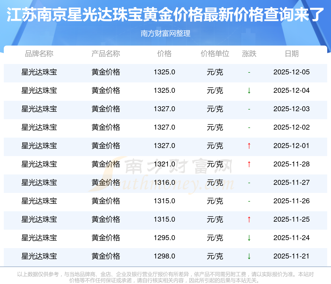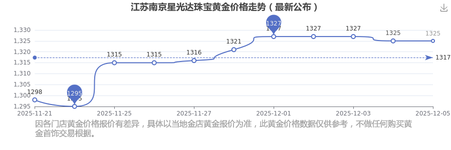 (2025年12月7日)今日江苏南京星光达珠宝黄金价格是1325.0元/克。