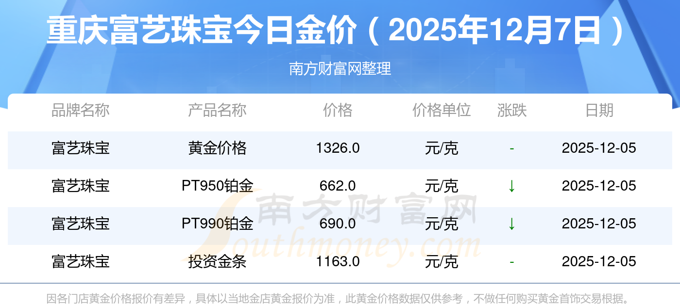 今日黄金价格是怎样的?当下黄金一克要卖多少钱? 2025年12月7日重庆富艺珠宝黄金的单价,一克为多少?黄金价格1328.0元/克,铂金价格662.0元/克,饰品金价(内地)1328.0元/克,黄金饰品(香港)46550.0,铂金价格(香港)18970.0,金条价格(香港)41990.0,金条金价(内地)1165.0元/克,黄金价格1325.0元/克,铂金价格600.0元/克,足金价格1325.0元/克,黄金价格1289.0元/克。