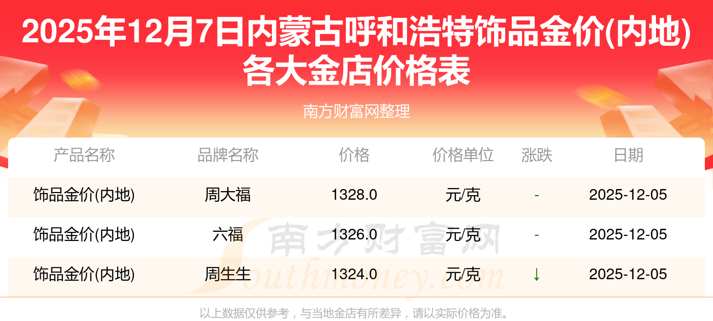 2025年12月7日内蒙古呼和浩特各大金店饰品金价(内地)最新价格:周大福1328.0元/克,周大福662.0元/克,周大福1328.0元/克,周大福46550.0,周大福18970.0,周大福41990.0,周大福1165.0元/克,老凤祥1325.0元/克,老凤祥600.0元/克,老凤祥1325.0元/克,周六福1289.0元/克。