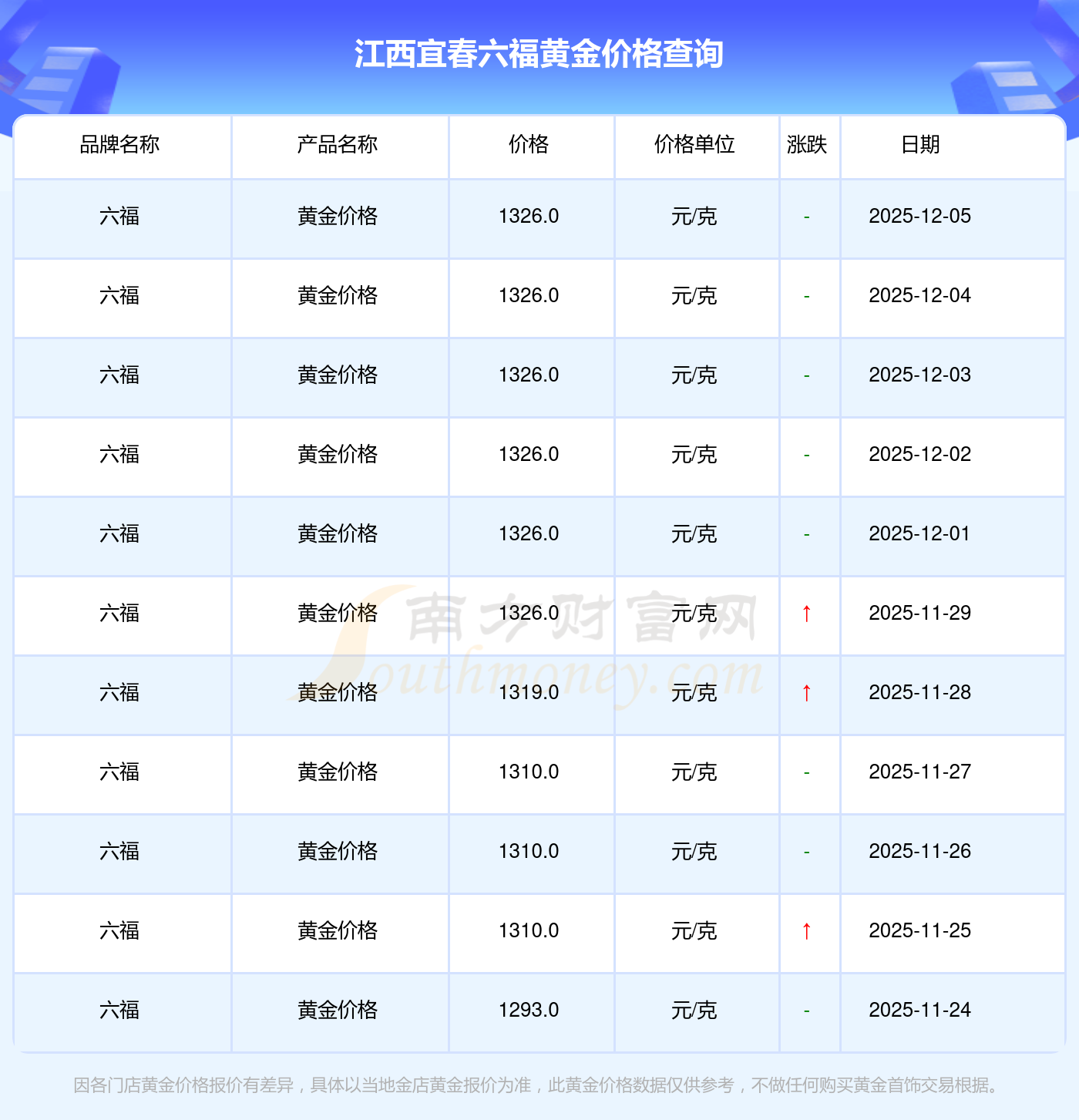 2025年12月7日这一天,江西宜春六福的黄金价格以 1326.0元/克的价格售卖。