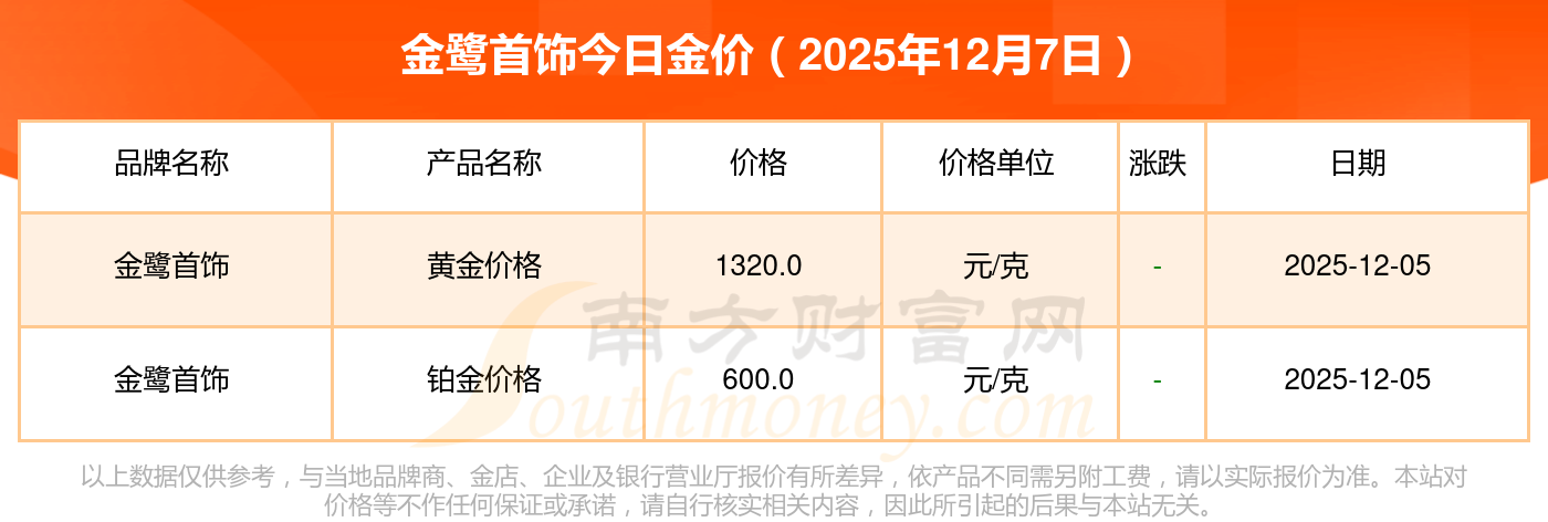 2025年12月7日金鹭首饰今日价格:黄金价格1328.0元/克,铂金价格662.0元/克,饰品金价(内地)1328.0元/克,黄金饰品(香港)46550.0,铂金价格(香港)18970.0,金条价格(香港)41990.0,金条金价(内地)1165.0元/克,黄金价格1325.0元/克,铂金价格600.0元/克,足金价格1325.0元/克,黄金价格1289.0元/克。