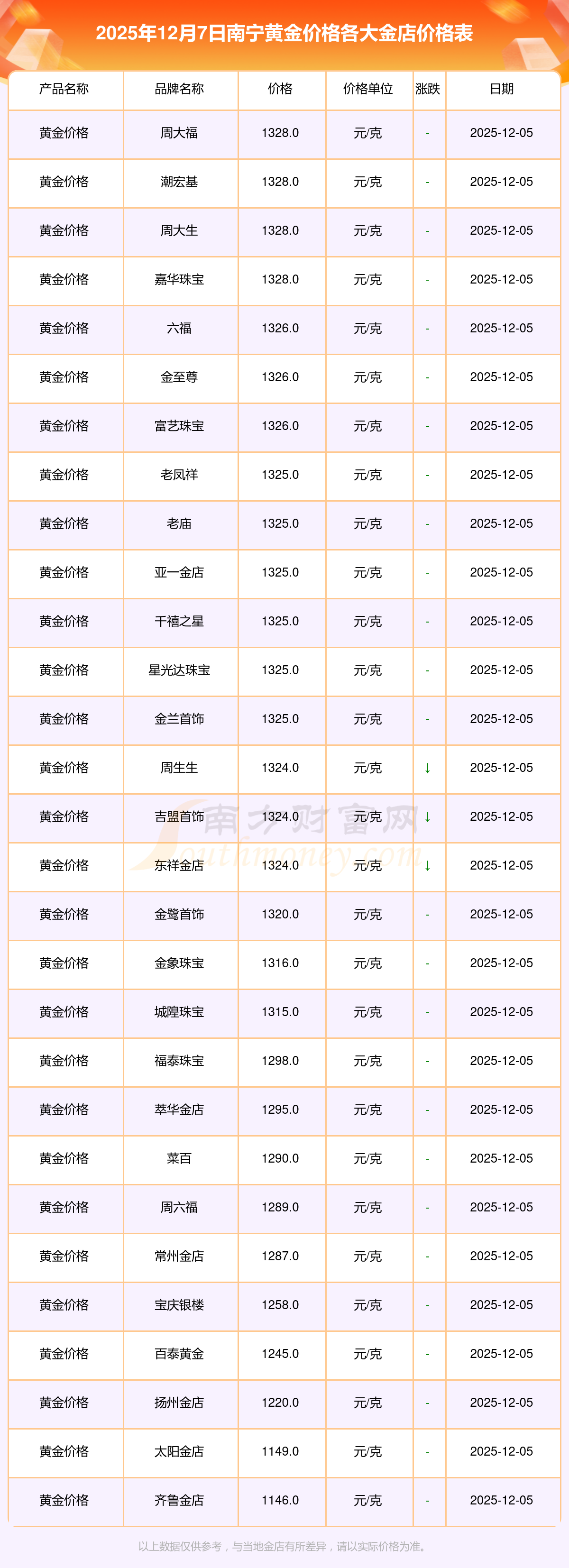 二、2025年12月7日今日南宁各金店黄金价格实时行情汇总
