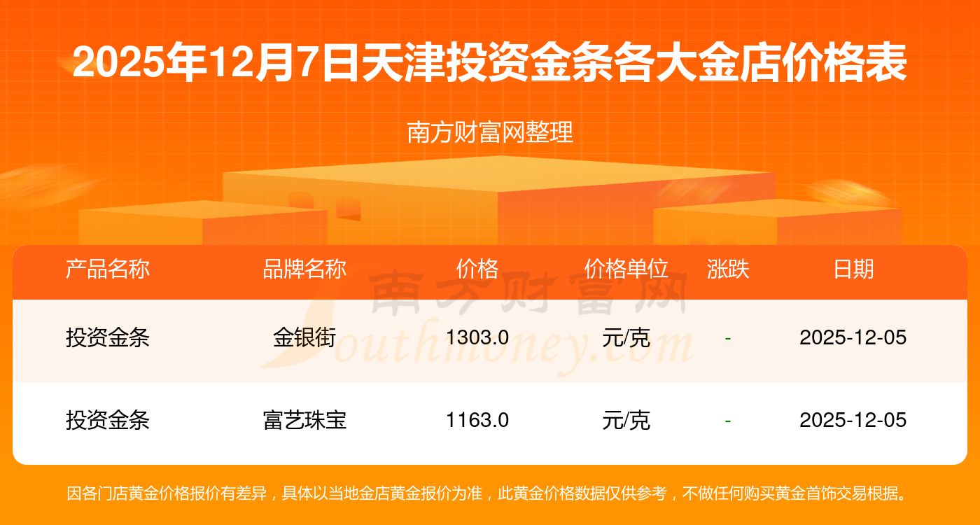 据了解到,今日天津投资金条报价最高的金店是金银街,为1303.0元/克,报价最低的金店是富艺珠宝,为1163.0元/克。今日投资金条高低差为140元/克。