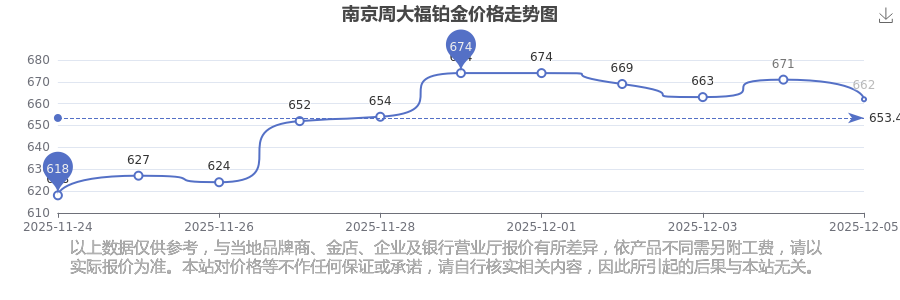 今日(2025年12月7日)南京周大福铂金价格:662.0元/克。