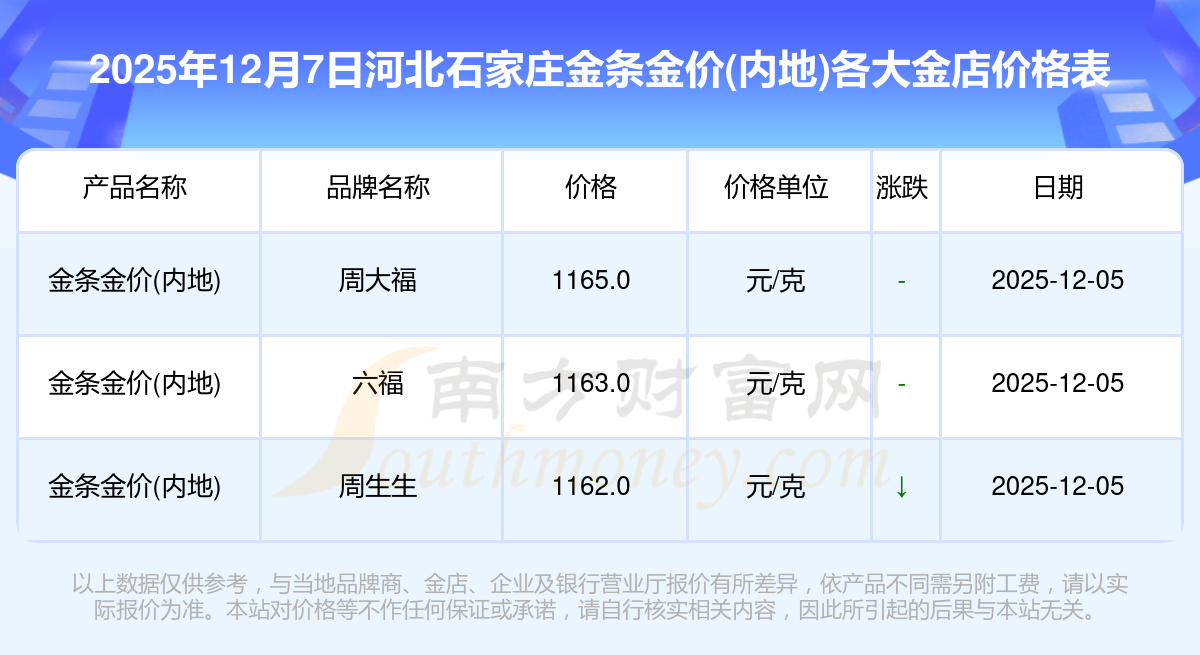2025年12月7日,河北石家庄周大福、周大福、周大福、周大福、周大福、周大福、周大福、老凤祥、老凤祥、老凤祥、周六福等各大金店品牌金条金价(内地)今日价格如下:周大福1328.0元/克、周大福662.0元/克、周大福1328.0元/克、周大福46550.0、周大福18970.0、周大福41990.0、周大福1165.0元/克、老凤祥1325.0元/克、老凤祥600.0元/克、老凤祥1325.0元/克、周六福1289.0元/克。