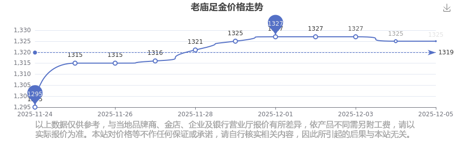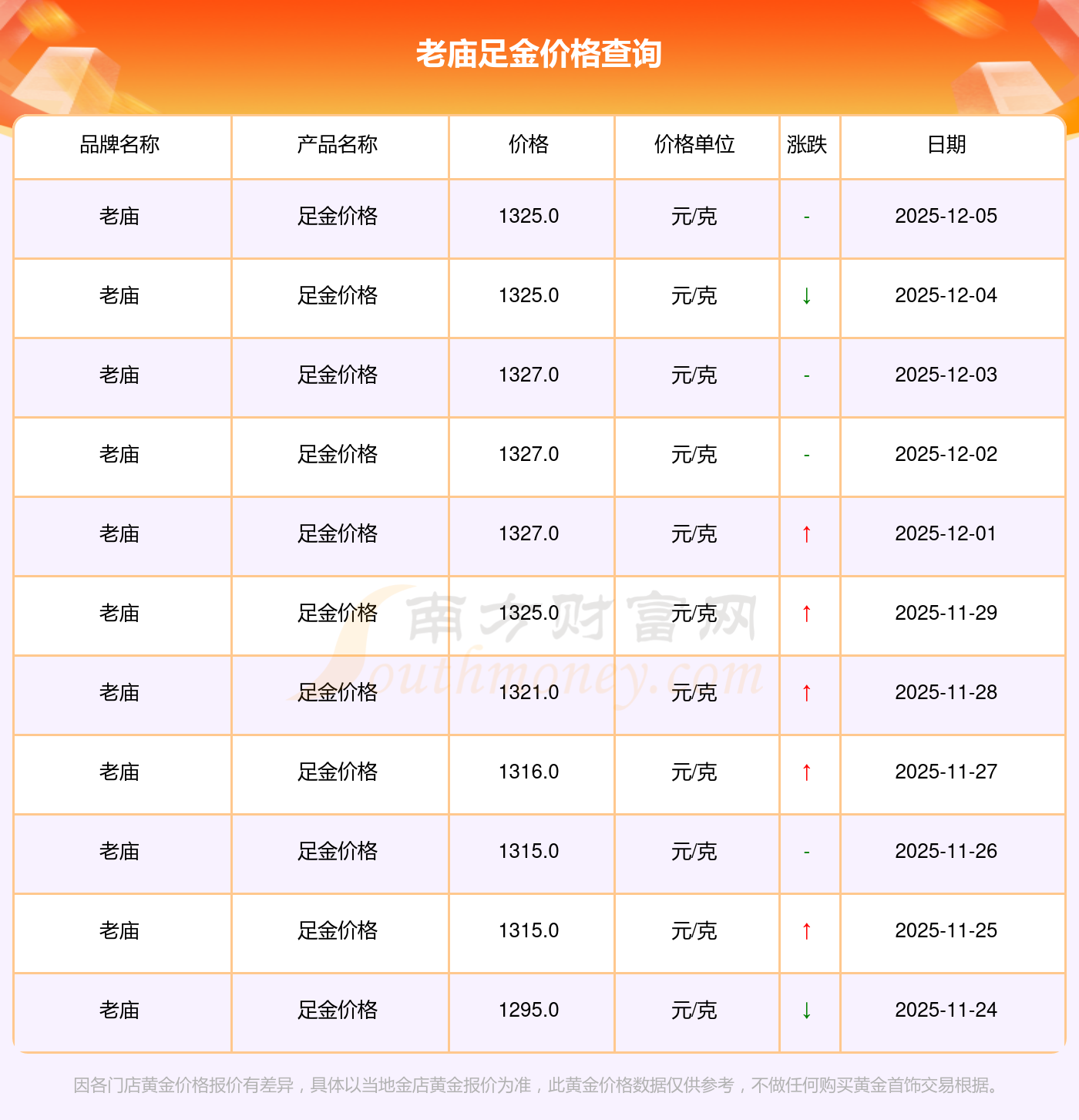 老庙 足金价格在今日的最新价格显示为1325.0元/克。