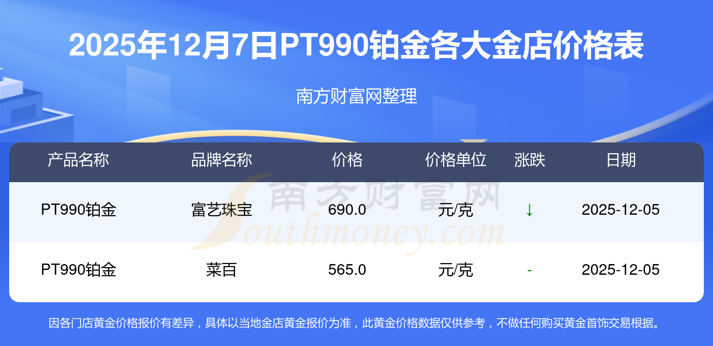 今天是2025年12月7日,周大福、周大福、周大福、周大福、周大福、周大福、周大福、老凤祥、老凤祥、老凤祥、周六福等各大金店品牌PT990铂金最新价格如下:周大福1328.0元/克、周大福662.0元/克、周大福1328.0元/克、周大福46550.0、周大福18970.0、周大福41990.0、周大福1165.0元/克、老凤祥1325.0元/克、老凤祥600.0元/克、老凤祥1325.0元/克、周六福1289.0元/克。