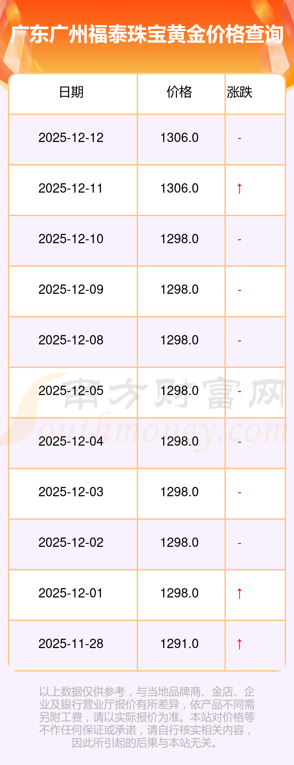 今日广东广州福泰珠宝黄金价格公布当下,今日的黄金一克卖多少钱今日广东广州福泰珠宝黄金价格最新价格是1306.0元/克。