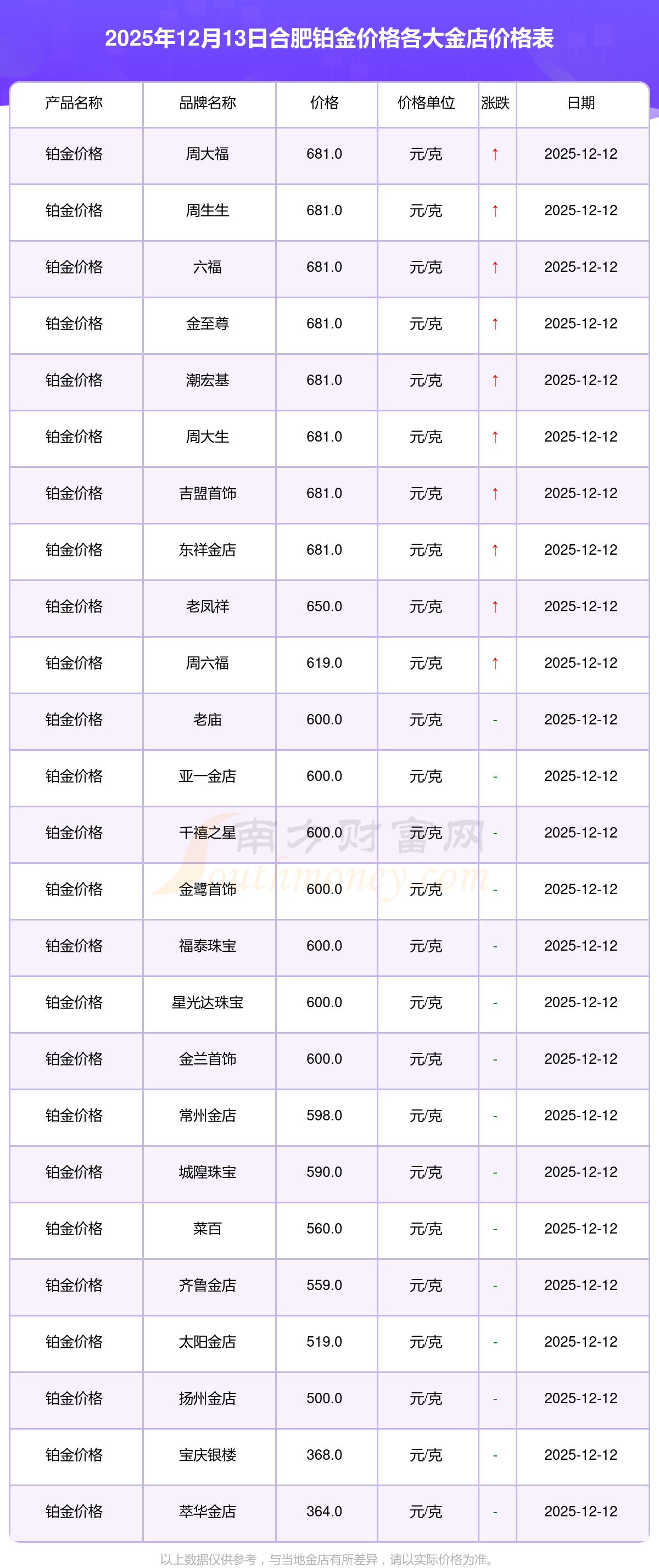 总之,今日合肥铂金价格最高的金店是周大福,报价681.0元/克,铂金价格最低的金店是萃华金店,报价364.0元/克。今日铂金价格高低差为317元/克。