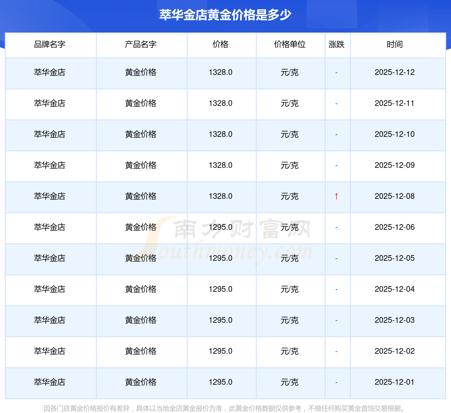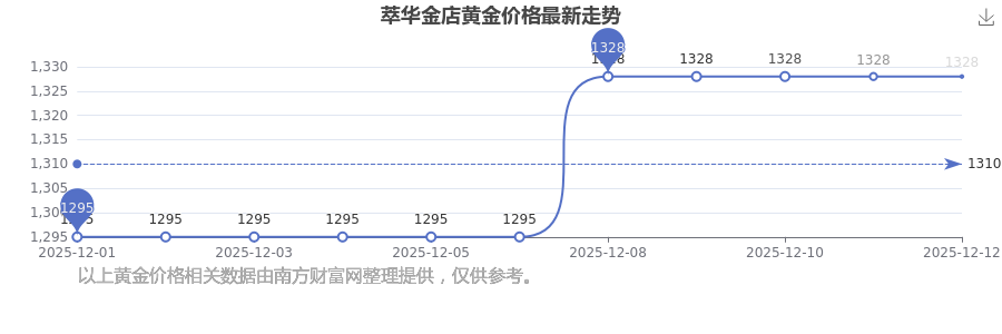 据了解,今日萃华金店 黄金价格的最新价格为1328.0元/克。
