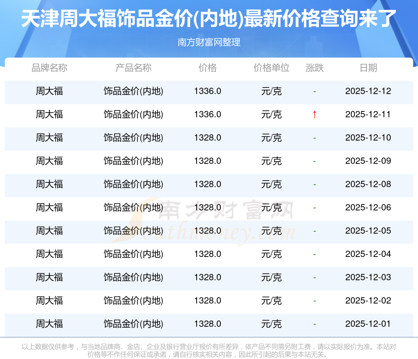1336.0元/克,此乃天津周大福于 2025年12月13日饰品金价(内地)的挂牌价格。