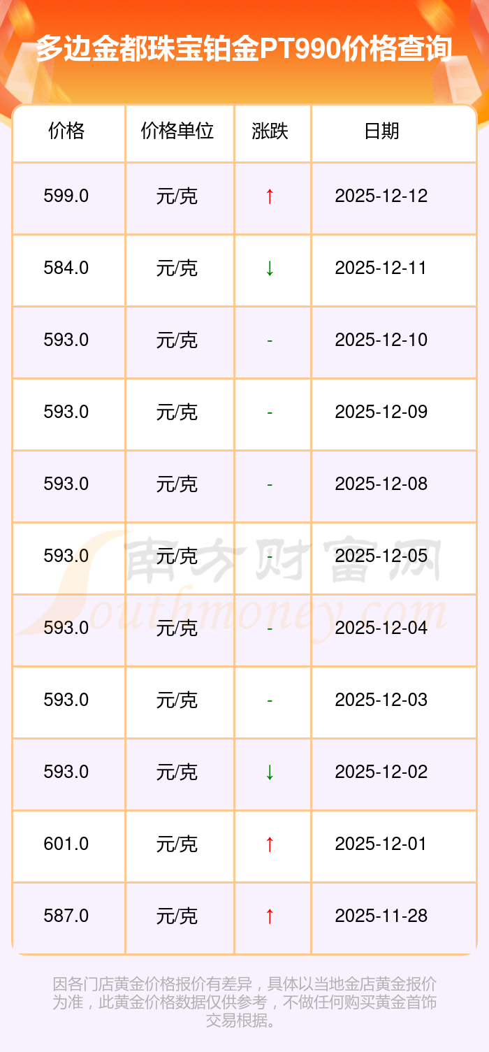 多边金都珠宝 铂金PT990于今日的最新挂牌价为599.0元/克。