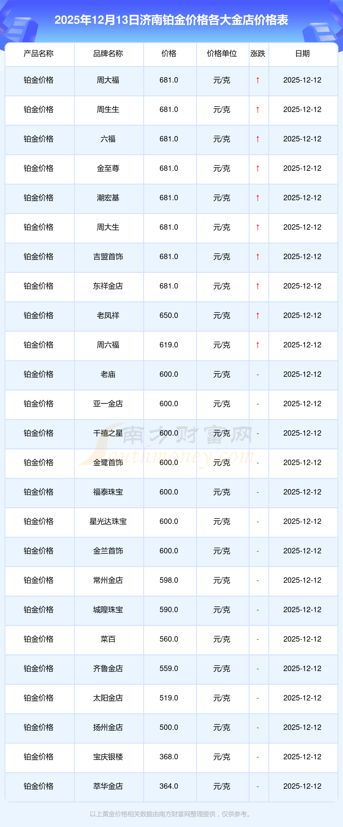今日济南铂金价格报价最高的金店是周大福,为681.0元/克,报价最低的金店是萃华金店,为364.0元/克。今日铂金价格高低差为317元/克。