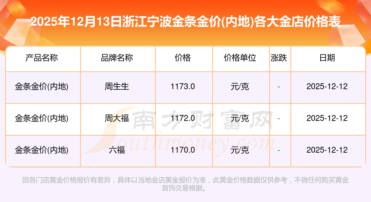 2025年12月13日浙江宁波周大福、周大福、老凤祥、老凤祥、老庙、老庙、周生生、周生生、周大福、周大福、周大福等各大金店品牌金条金价(内地)最新价格行情来了,如下:周大福黄金价格1336.0元/克,周大福铂金价格681.0元/克,老凤祥黄金价格1337.0元/克,老凤祥铂金价格650.0元/克,老庙黄金价格1339.0元/克,老庙铂金价格600.0元/克,周生生黄金价格1338.0元/克,周生生铂金价格681.0元/克,周大福饰品金价(内地)1336.0元/克,周大福黄金饰品(香港)47410.0,周大福铂金价格(香港)19550.0。