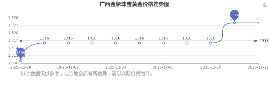 今日广西金象珠宝黄金价格为1324.0元/克。