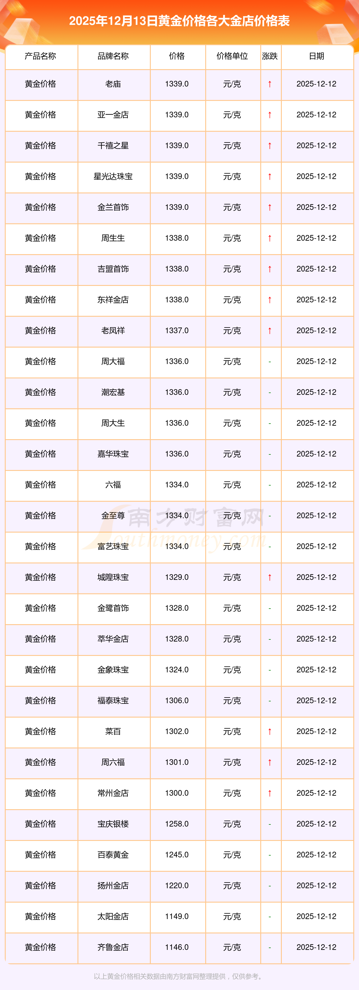 今天是2025年12月13日,周大福、周大福、老凤祥、老凤祥、老庙、老庙、周生生、周生生、周大福、周大福、周大福等各大金店品牌黄金价格最新价格如下:周大福1336.0元/克、周大福681.0元/克、老凤祥1337.0元/克、老凤祥650.0元/克、老庙1339.0元/克、老庙600.0元/克、周生生1338.0元/克、周生生681.0元/克、周大福1336.0元/克、周大福47410.0、周大福19550.0。