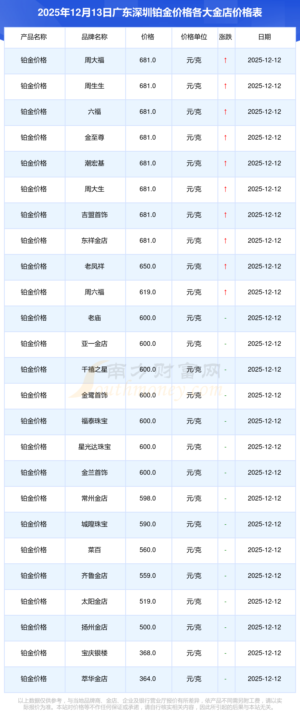 2025年12月13日广东深圳周大福、周大福、老凤祥、老凤祥、老庙、老庙、周生生、周生生、周大福、周大福、周大福等各大金店品牌铂金价格最新价格如下:周大福黄金价格1336.0元/克,周大福铂金价格681.0元/克,老凤祥黄金价格1337.0元/克,老凤祥铂金价格650.0元/克,老庙黄金价格1339.0元/克,老庙铂金价格600.0元/克,周生生黄金价格1338.0元/克,周生生铂金价格681.0元/克,周大福饰品金价(内地)1336.0元/克,周大福黄金饰品(香港)47410.0,周大福铂金价格(香港)19550.0。
